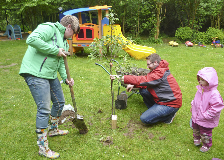 Ein Apfelbäumchen wurde vom »Apfelparadies« in Kapellen gestiftet. Mal sehen, wie groß er in 20 Jahren ist!